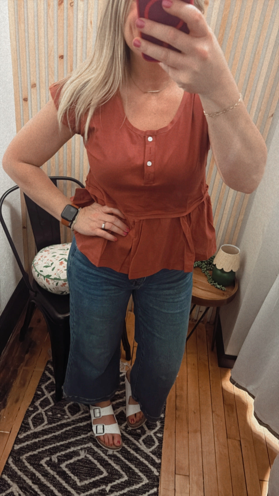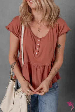 Chestnut Short Sleeve U Neck Buttons Splicing Ruffle Blouse