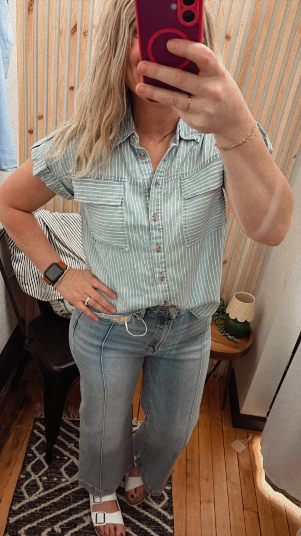 COLLARED SHORT TAB SLEEVE BUTTON DOWN POCKET WITH TAB YOKE DETAIL STRIPE PATTERN CHAMBRAY SHIRT 100% LYOCELL