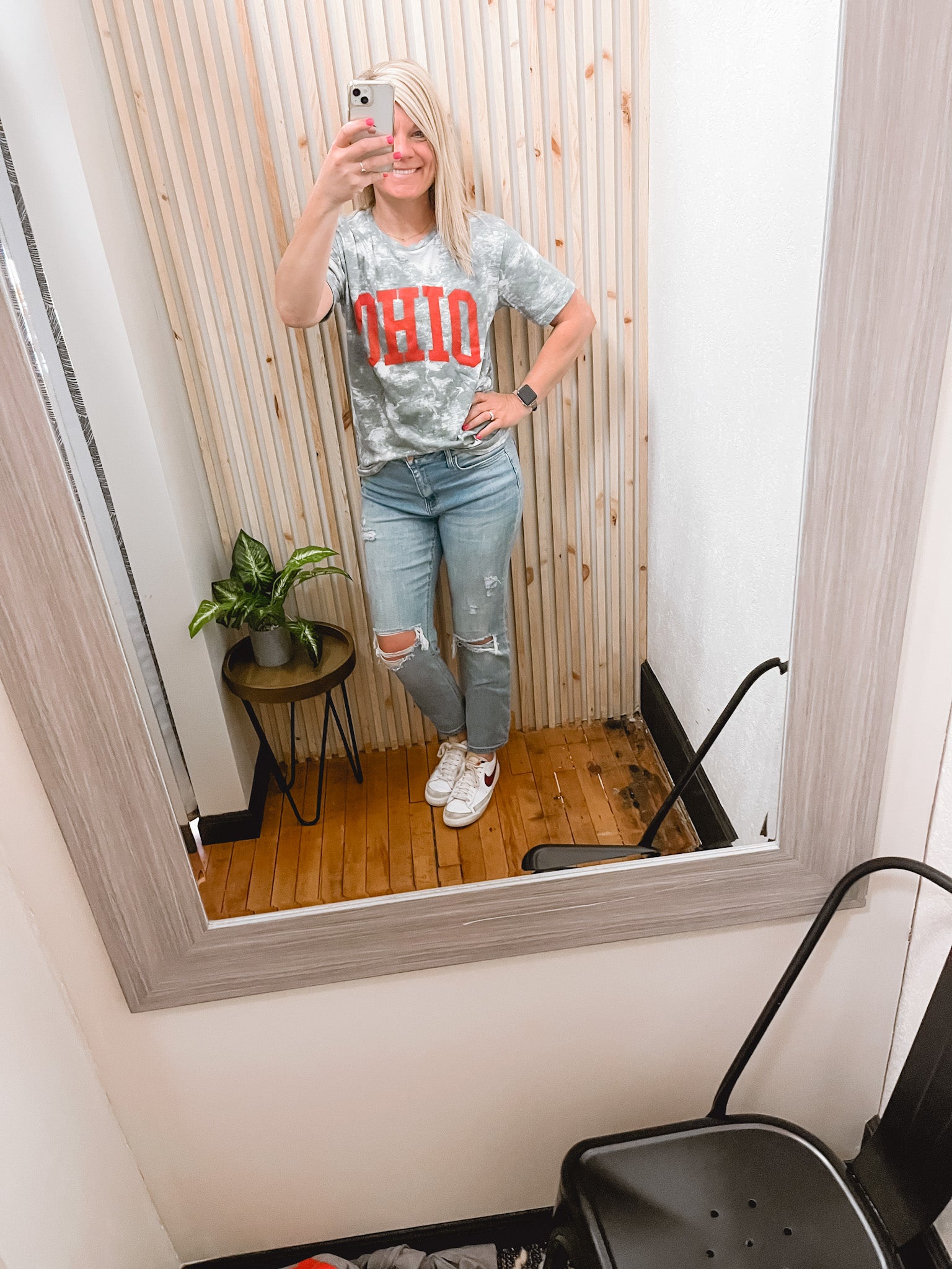 unisex fit, gray tie dye super soft tee printed in matte red ink