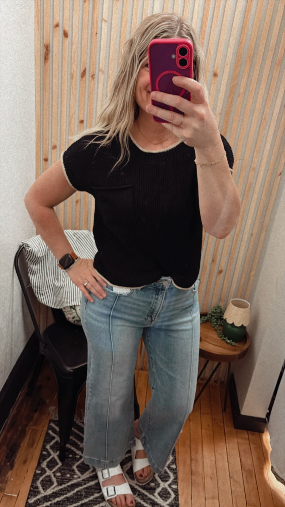 Contrast Trim Short Sleeve Pocket Detail Sweater