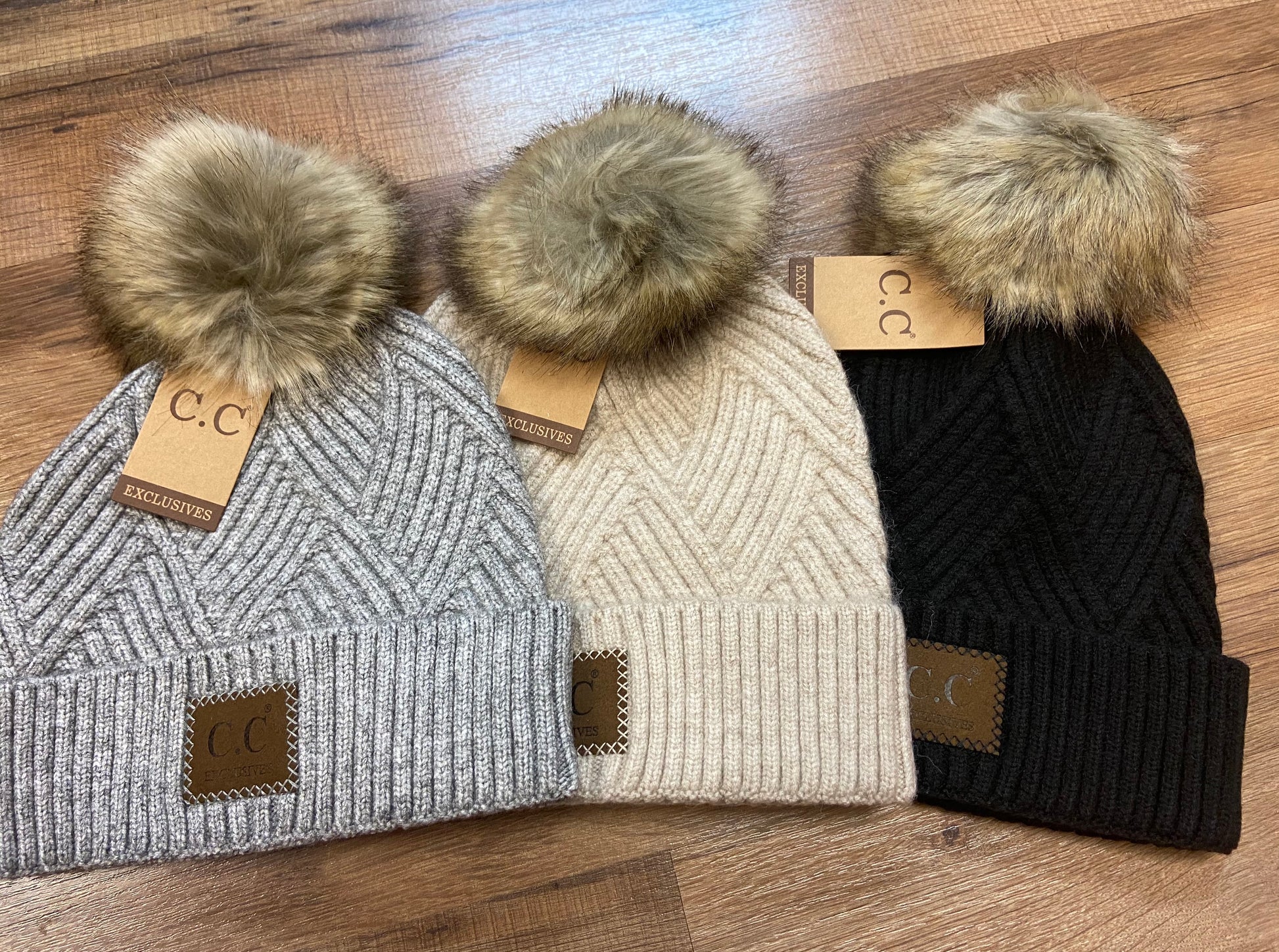Kids Diagonal Stripe Knit Pattern Pom Beanie with C.C Brand Leather Patch.
