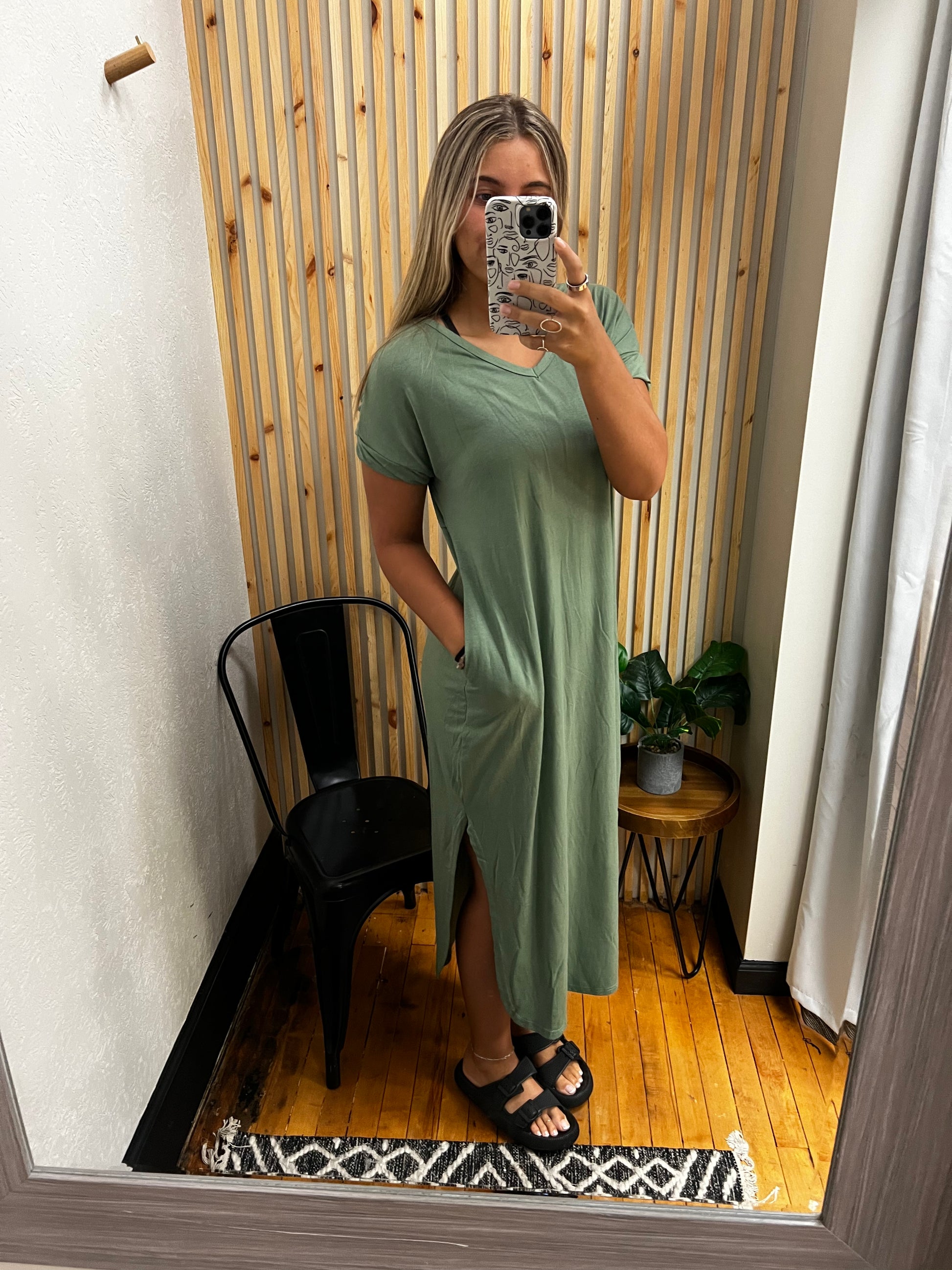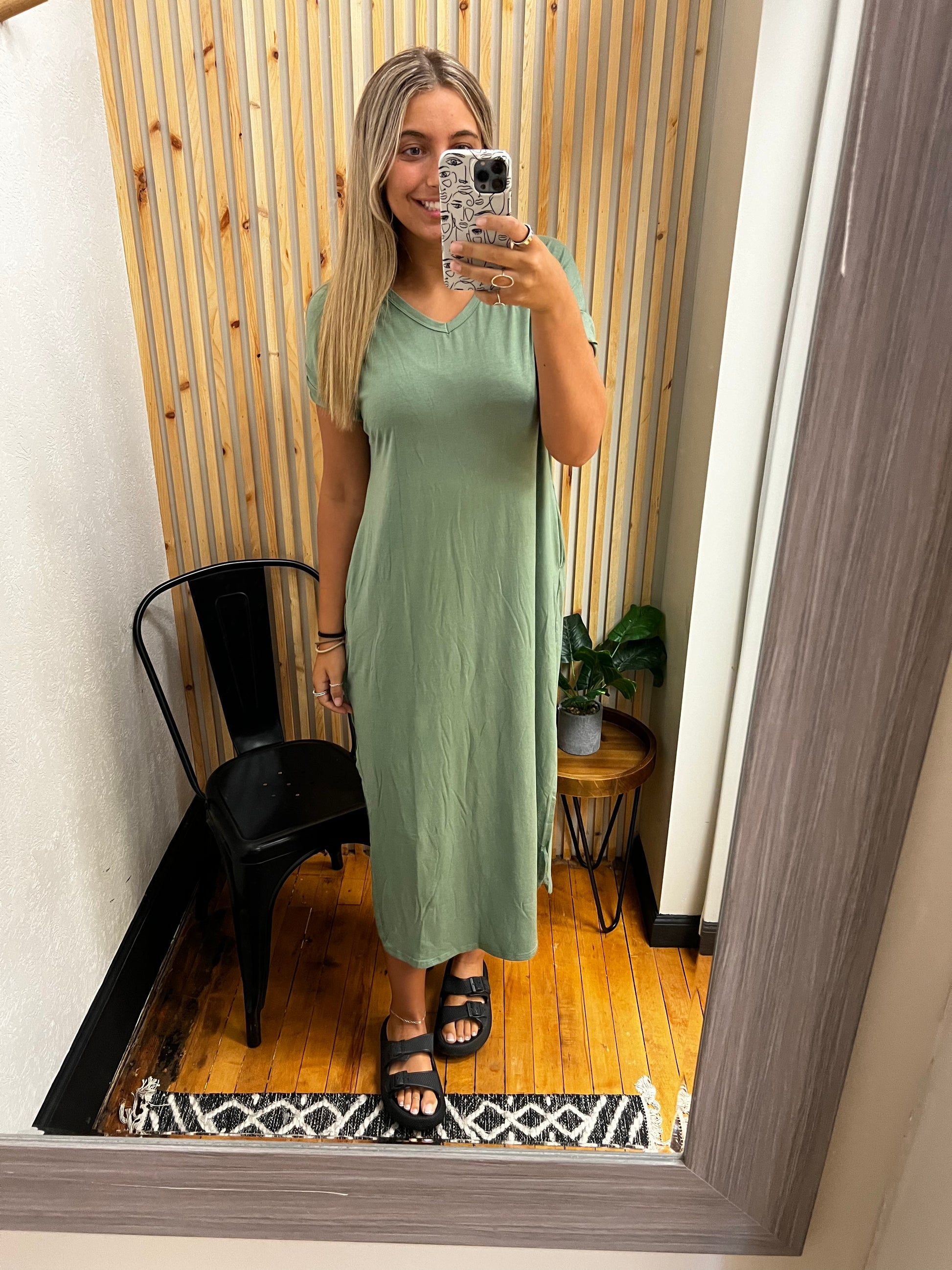 Grass Green V Neck Hidden Pocket Splits Maxi T-shirt Dress