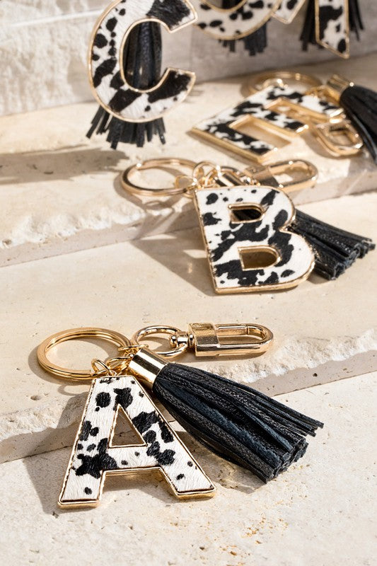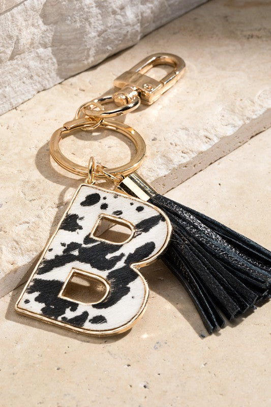Genuine leather tassel with brushed animal print initial letter charm and metal loop key chain holder *Initial (Genuine leather), Tassel (PU leather) *Lead/Cadmium Compliant *APPROX. L 5.50" Pendant L 2" W 2"