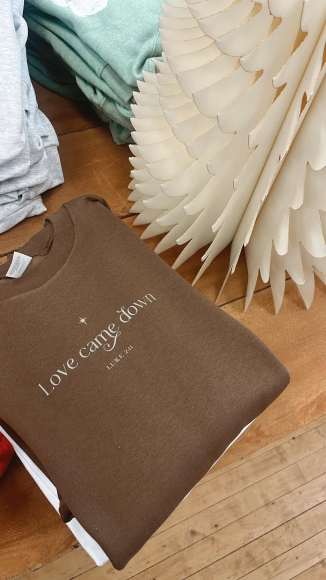 unisex fit crew sweatshirt, printed in a muted tan/gold