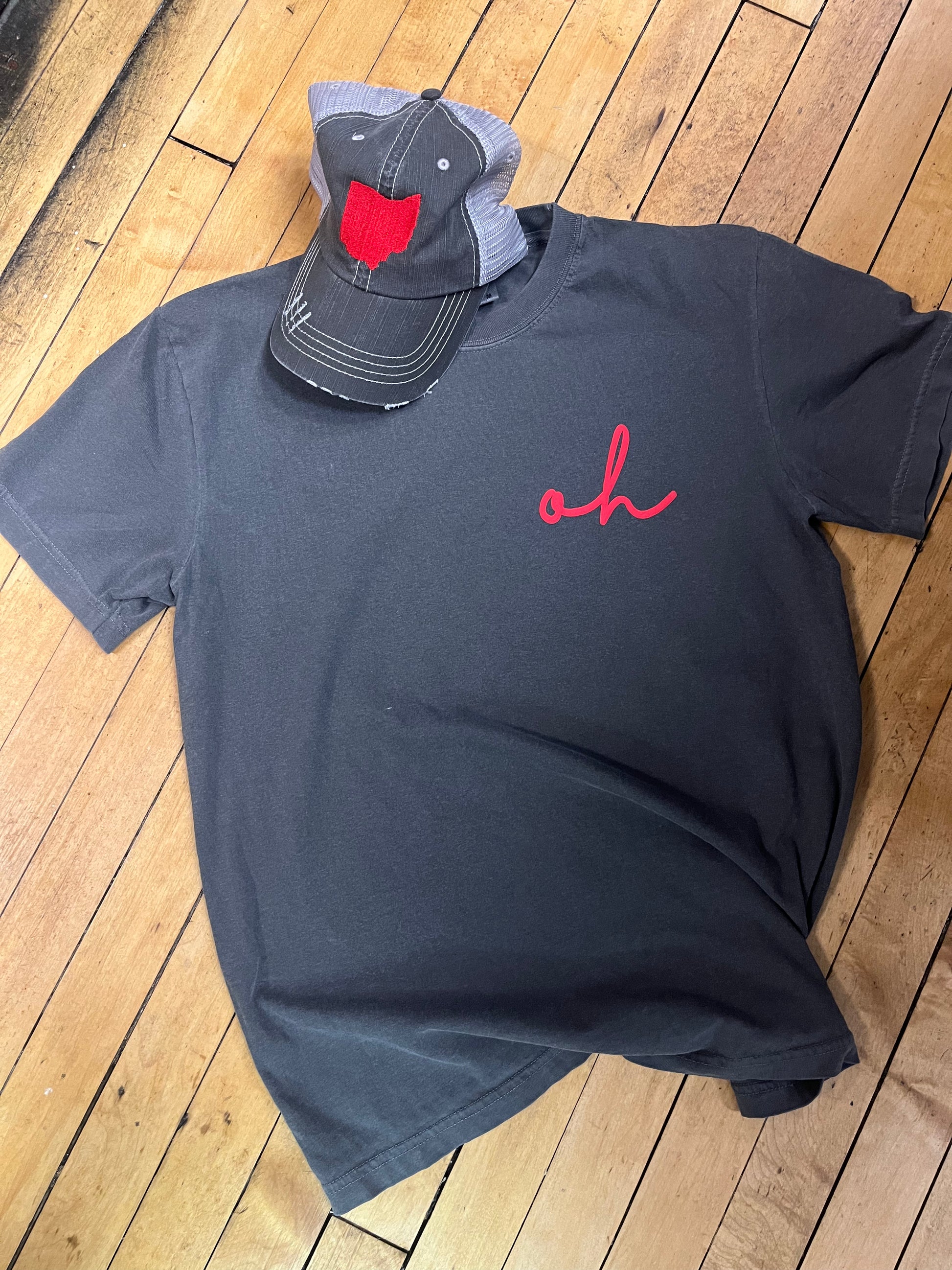 unisex fit, charcoal with left chest puff red oh script