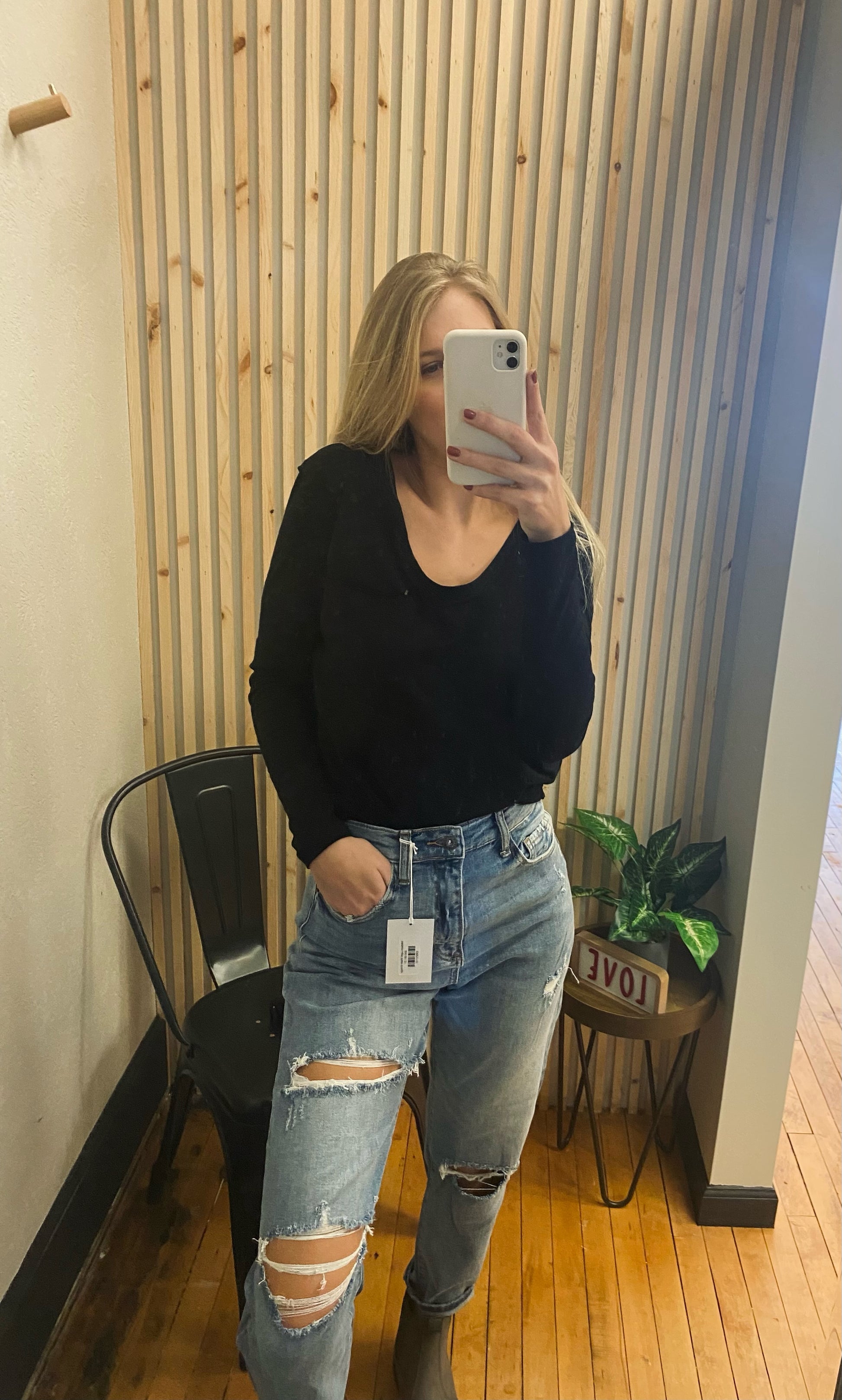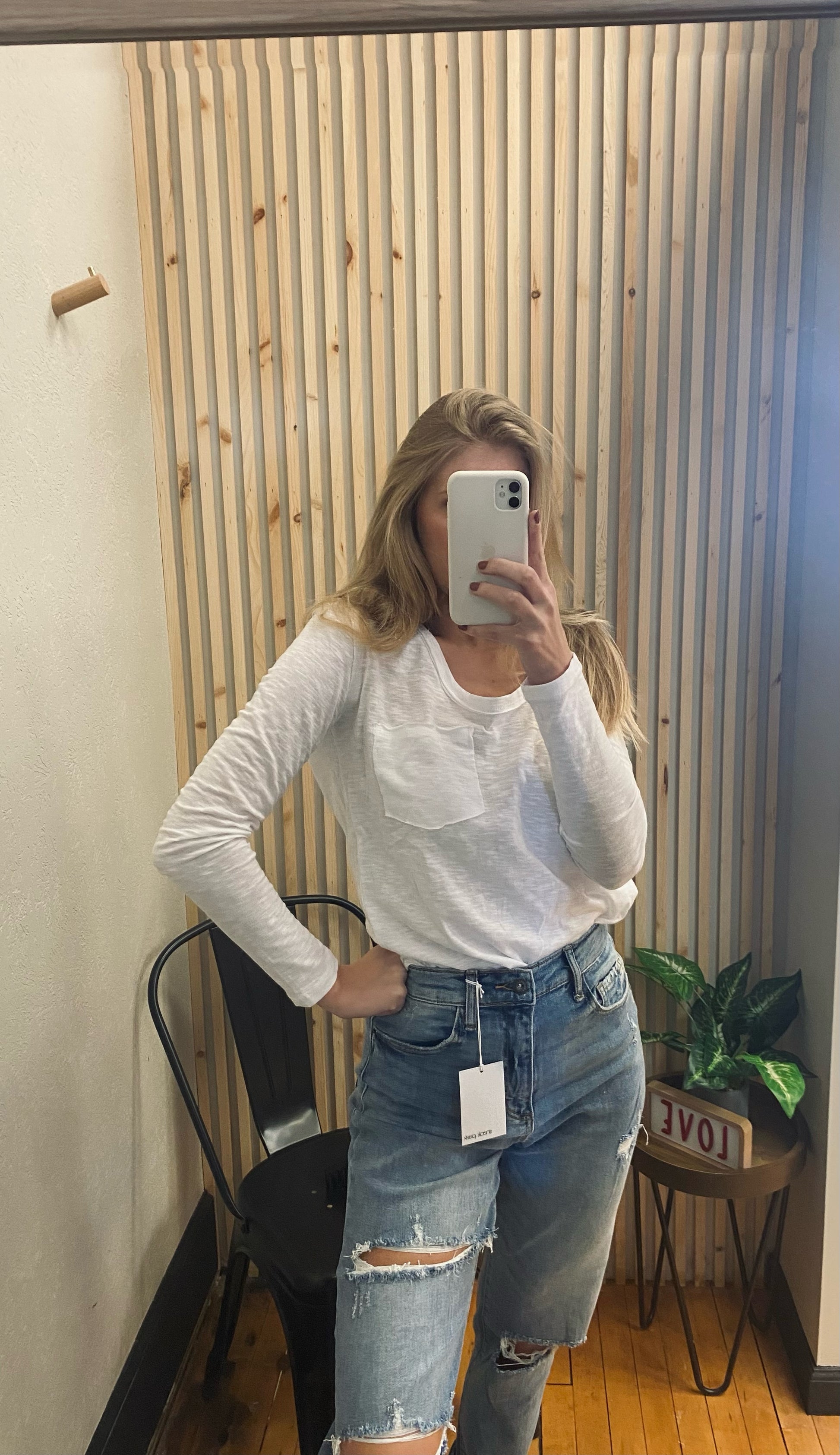 relaxed fit, long sleeve heathered fabric tee with pocket detail.