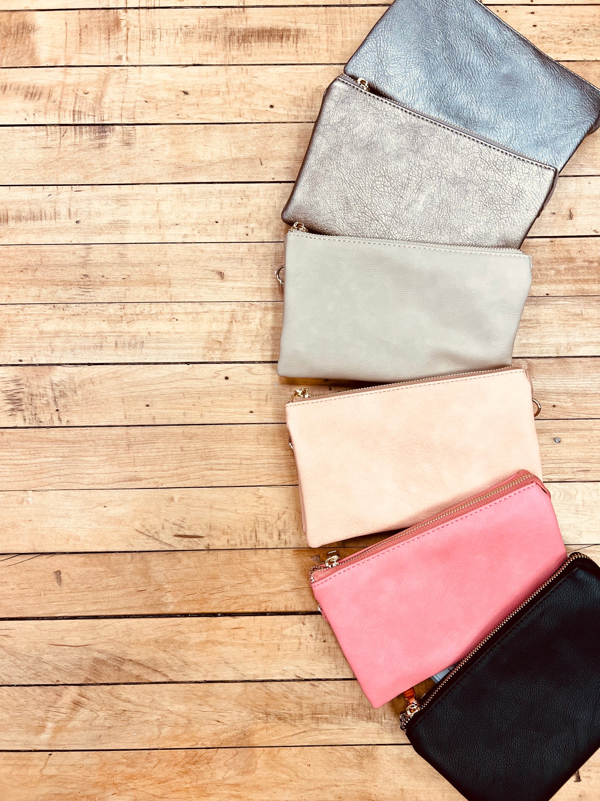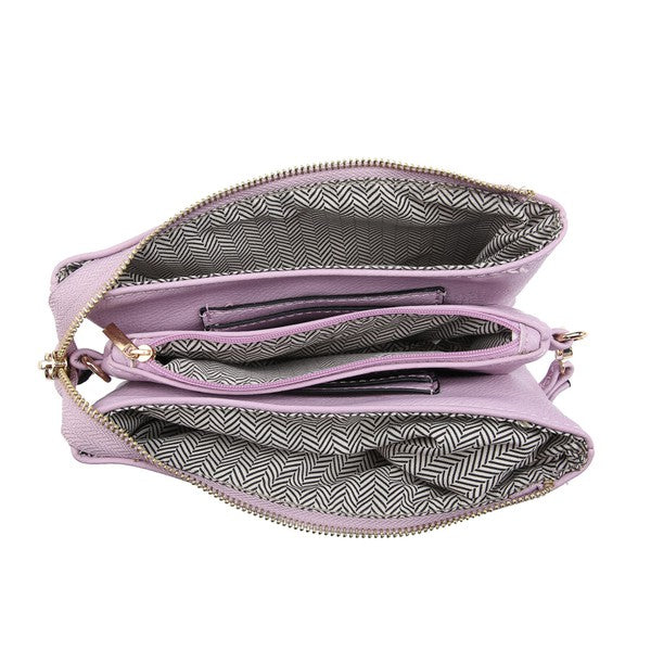 Three compartment crossbody/wristlet with top zip closure and inner card slots.